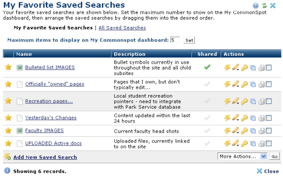 In addition, contributors can create and save frequently used or specialized search queries for faster, more focused search operations.  CommonSpot supports storing both page and image searches, favorites for quick access, and sharing saved searches for reliably distributing and updating commonly used data sets.