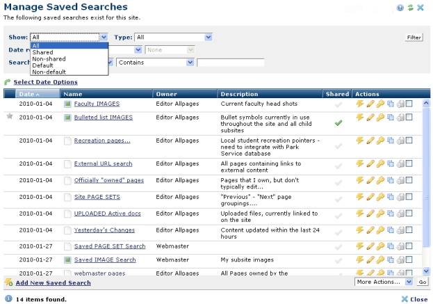 Administrators can add, delete, clone, and set security for your site’s saved searches.