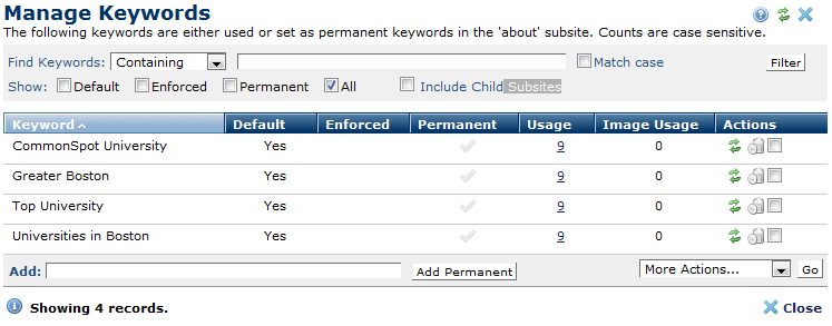 Contributors with Manage Keywords permission can create, delete, enforce and view keywords and usage frequency, as well as specify how keywords and groups of keywords are implemented.  This distributed control helps to eliminate keyword redundancy and increase the search relevancy of your content through a consistent, controlled vocabulary for your site.