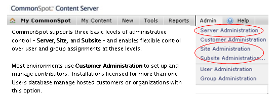 CommonSpot controls access to Administrator functions through roles and General Security permissions at the server, site, and subsite level.