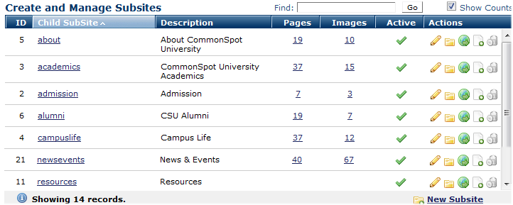 CommonSpot organizes content within a site by storing pages in subsites. A subsite is a logical structure for containing "like" content in a specified location. Use this section to manage child subsites for the current site.