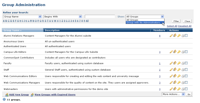 Authenticated admins can manage groups that have no assigned administrator. CommonSpot provides a report enabling you to view those groups, to improve security at your site. Click Groups with No Administrator from the Show dropdown, then click the Filter button to view this report, as shown above.