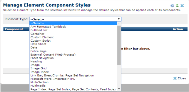 Use this dialog to assign styles to elements and element components by element type. Styles entered here are available for selection by contributors with Style permissions. Note that you can only assign and make available style classes first registered through the Manage Style Definitions dialog.