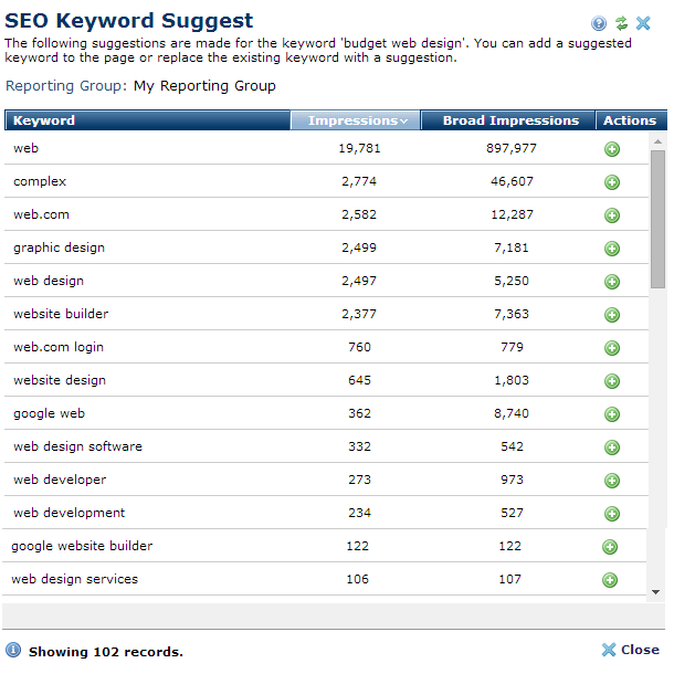 The SEO Keyword Suggest report displays when you click the suggestion icon option for a specific keyword in the SEO Administration Dashboard or from the SEO left pane. This option is only available if the Suggestions option is checked in the Add/Edit SEO Reporting Group dialog under the Suggest and Link Tracking tab.