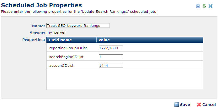 for this job in Site Scheduled Jobs or clicking Next in the process of adding a new Track SEO Keyword Rankings job displays job properties.