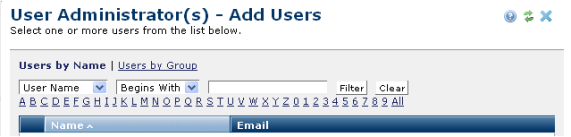 Access this dialog from the User Administrators dialog for selecting users for administrator assignments.