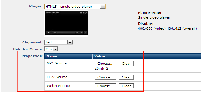 Properties: Provides options to view, change, or choose a multimedia file compatible with the current player, and optionally set output height and width and other attributes. Properties are service-, type -, and player-specific and will vary according to selections made for the preceding fields in this dialog. For example, HTML5 selections will display the following additional source options.